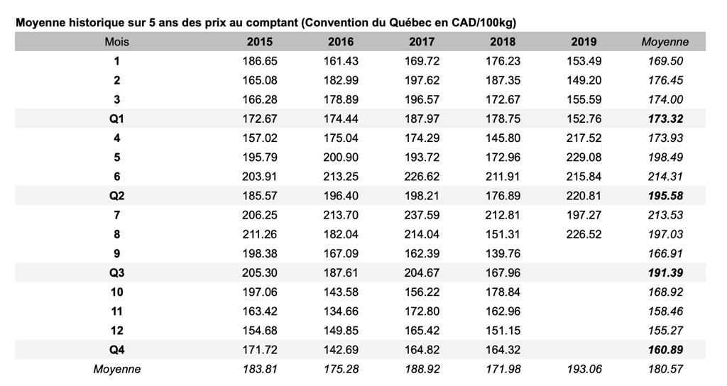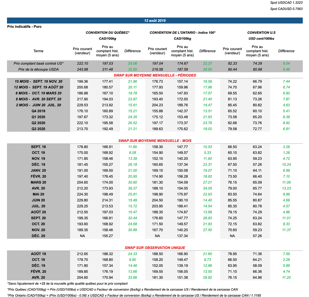 Voici les prix les plus récents sur le marché du porc et des grains: