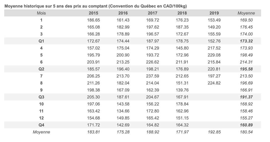 Voici les prix les plus récents sur le marché du porc et des grains:
