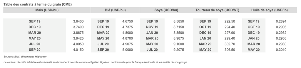 • Côté grains, l’attention se tourne vers le rapport du Département de l’agriculture (USDA) plus tard en matinée, afin de déterminer les inspections d'exportations et les conditions de récolte des grains américains cet après-midi. On rappelle que la publication la semaine dernière avait causé une chute importante des prix de grains, en raison des projections de rendements plus élevés des récoltes.