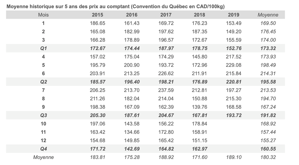 Voici les prix les plus récents sur le marché du porc et des grains: