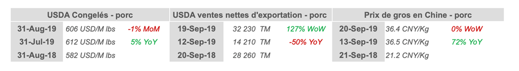 • Les importations de porc de la Chine ont bondi en août pour atteindre 162 935 tonnes, soit une augmentation de 76% par rapport à l'année précédente. La Chine a importé plus de 1,16 million de tonnes de viande de porc au cours des huit premiers mois de cette année, en hausse de 40% par rapport à l'année précédente.