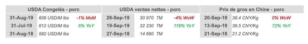• La production réelle de porc aux États-Unis pour la semaine se terminant le 21 septembre s'est établie à 547,0 millions de livres, en baisse par rapport à 553,5 millions la semaine précédente, mais en hausse de 12,6% par rapport à l'année précédente. Les données hebdomadaires sur le poids cette semaine ont été décevantes pour les gens qui voient un marché haussier.
