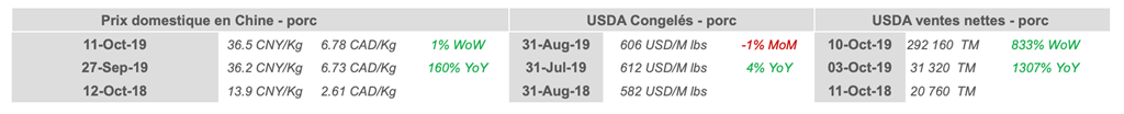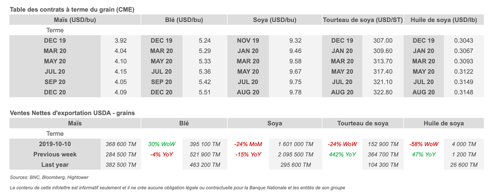 • La Chine qui anticipe une retour à la normale sur sa production porcine a certainement fait pression sur les prix des contrats de porcs hier. On risque de voir les prix remonter assez vite alors que les ventes nettes d'exportations US sont atteignent des records à 292k TM. La Chine a également passé des commandes pour 58,600 TM en 2020.