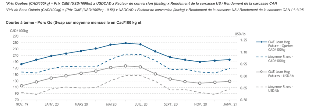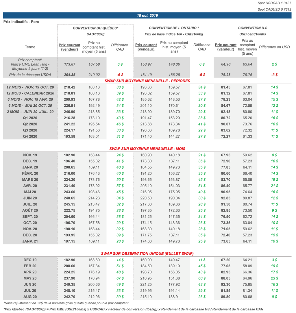 Voici les prix les plus récents sur le marché du porc et des grains: