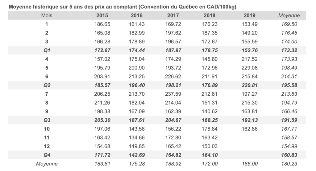 Voici les prix les plus récents sur le marché du porc et des grains: