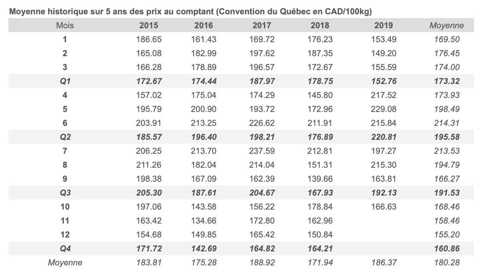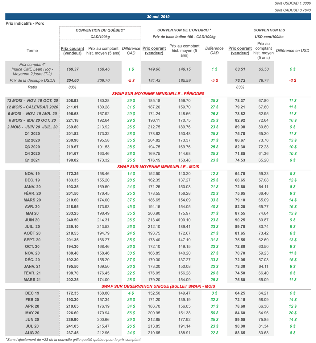 Voici les prix les plus récents sur le marché du porc et des grains: