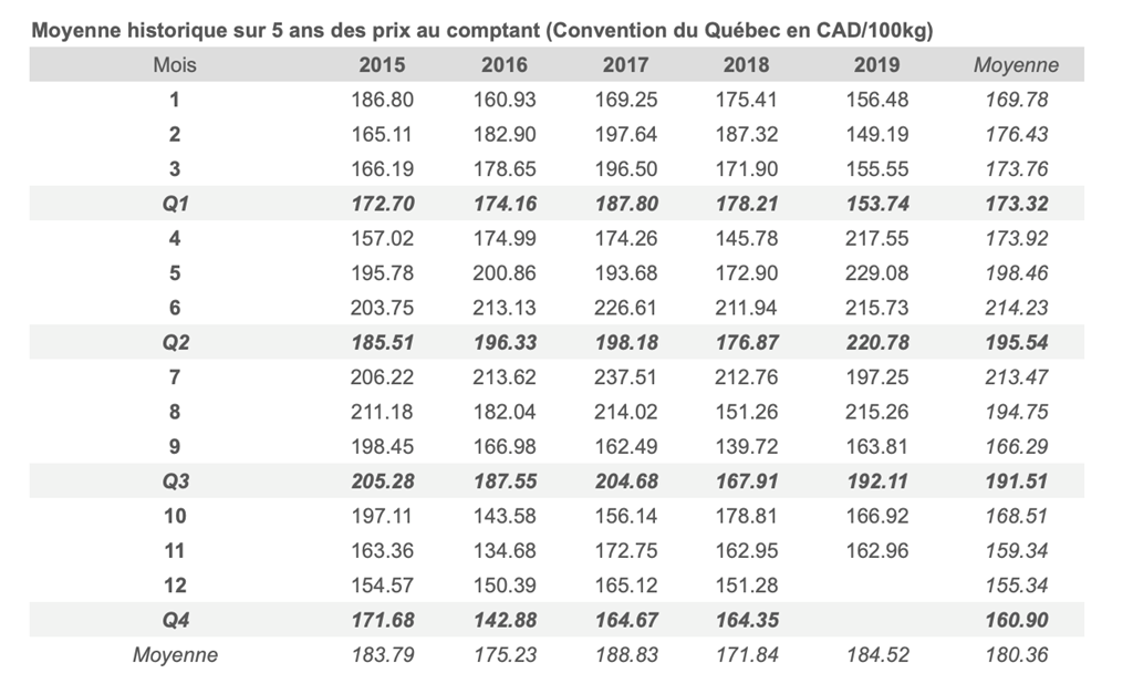Voici les prix les plus récents sur le marché du porc et des grains: