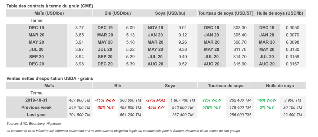 • Les États-Unis exigent de la Chine qu'elle précise en détail comment elle compte atteindre chaque année 50 milliards de dollars d'importations agricoles, ce qui est devenu un point de tension dans les négociations sur un accord commercial de phase 1.