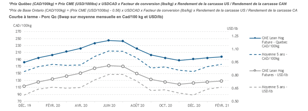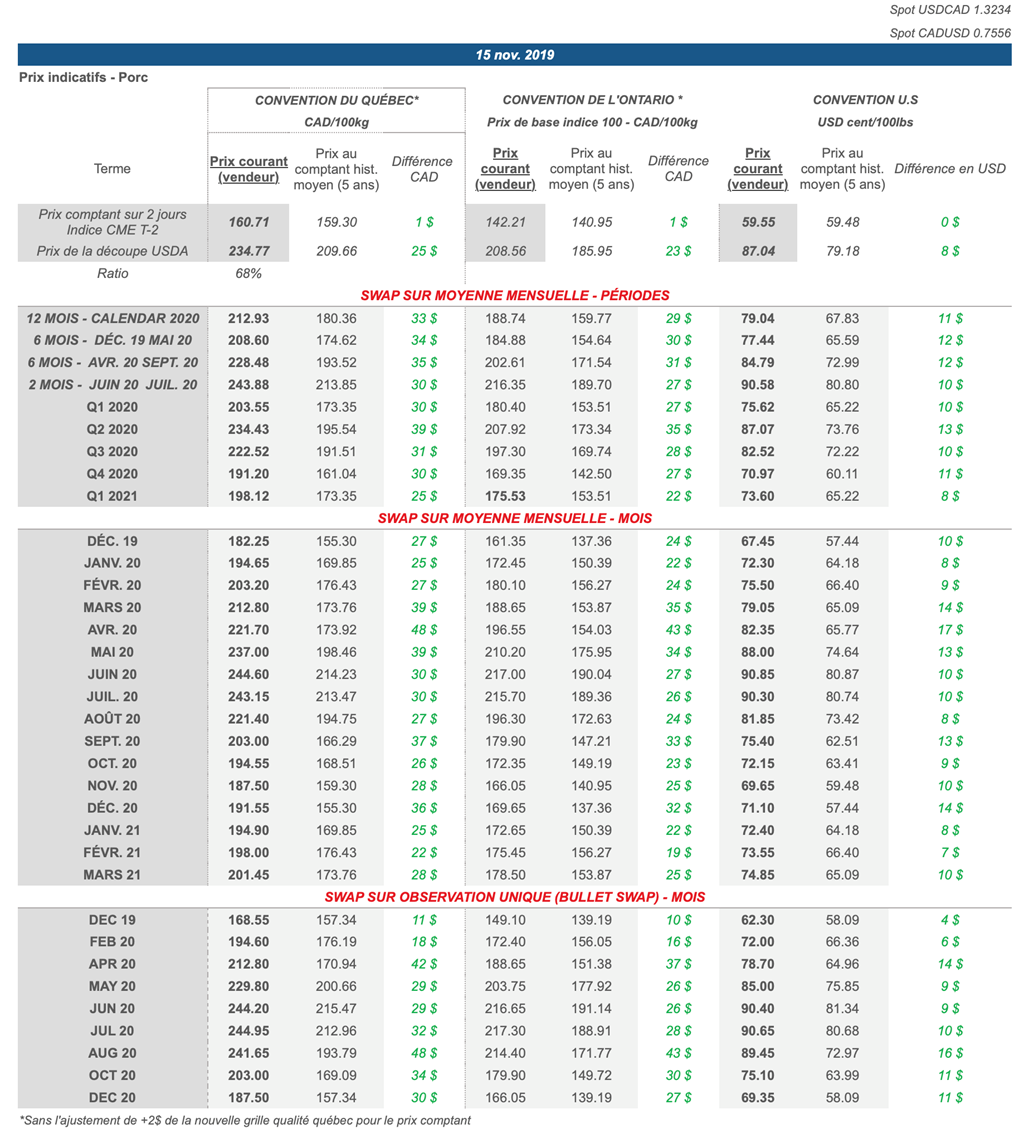 Voici les prix les plus récents sur le marché du porc et des grains: