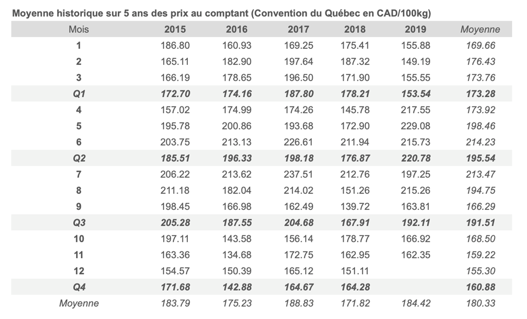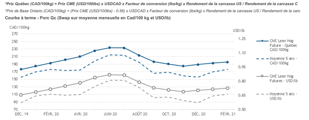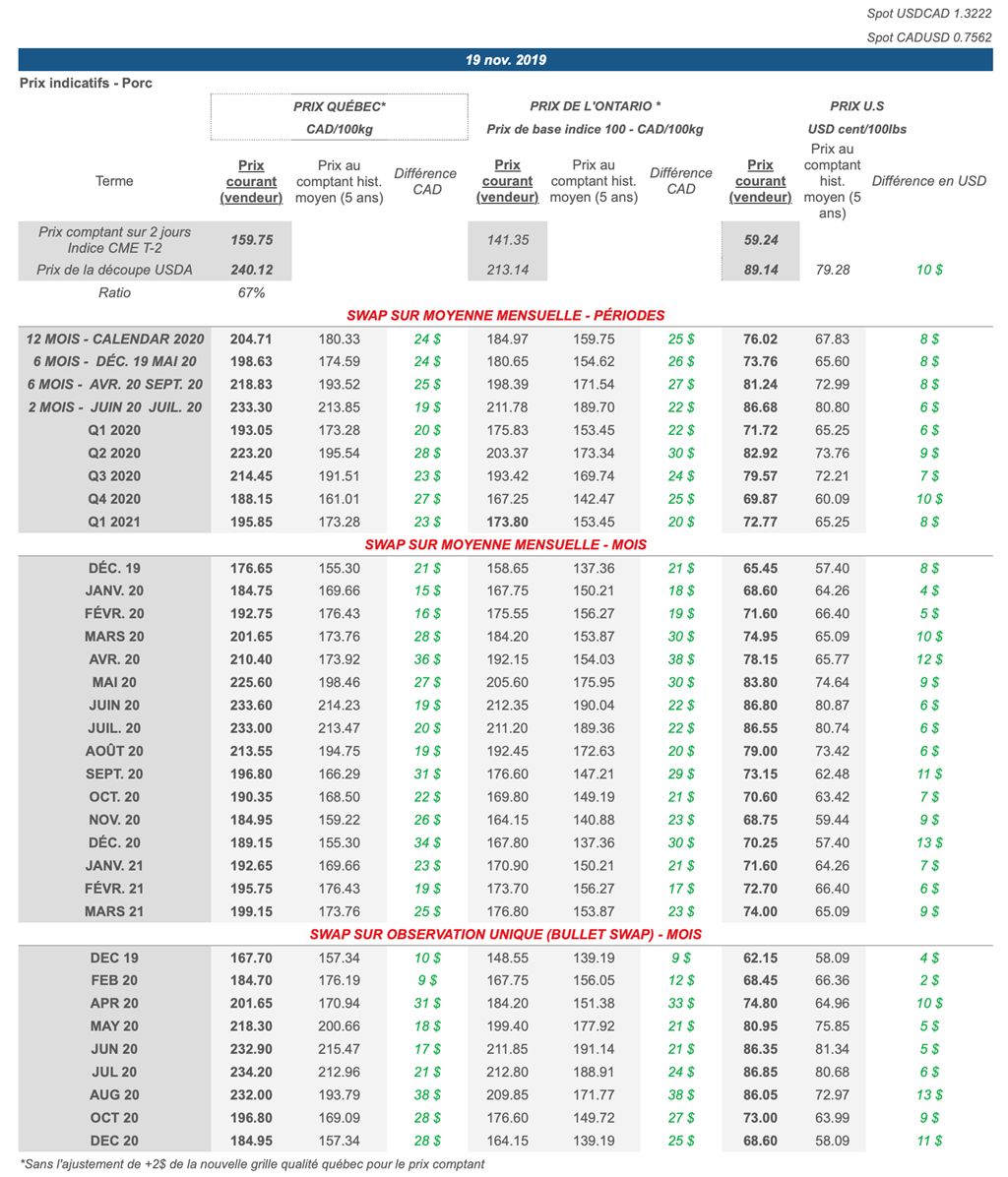 Voici les prix les plus récents sur le marché du porc et des grains: