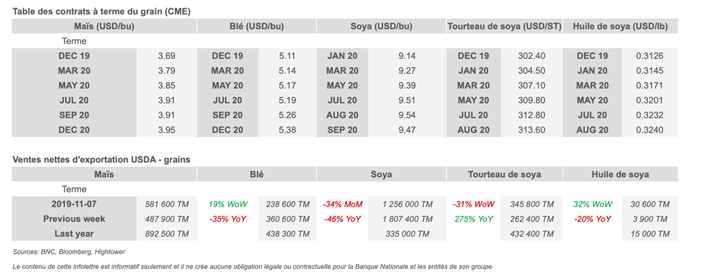 • Statistique Canada diminuera probablement les estimations de la production dans son rapport du 6 décembre après la neige et les précipitations dans l'ouest du pays, a annoncé mardi Agriculture et Agroalimentaire Canada, une autre unité gouvernementale. "Dans l'ouest canadien, la récolte est presque terminée, mais la qualité de la récolte de certains produits est bien inférieure à celle de l'année dernière, en particulier pour les céréales. Dans les provinces des Prairies, on craint qu'une partie de la récolte ne soit récoltée avant le printemps, à moins que des conditions météorologiques favorables facilitent l'achèvement de la récolte.» Au 1er novembre, 16% de la récolte de canola, soit 3,2 millions de tonnes, reste non récoltée, a déclaré Ag Canada.