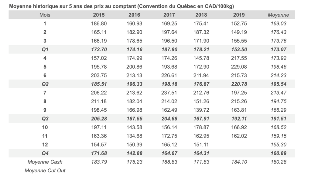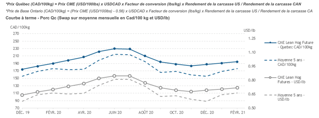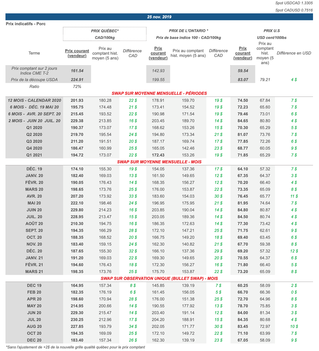 Voici les prix les plus récents sur le marché du porc et des grains: