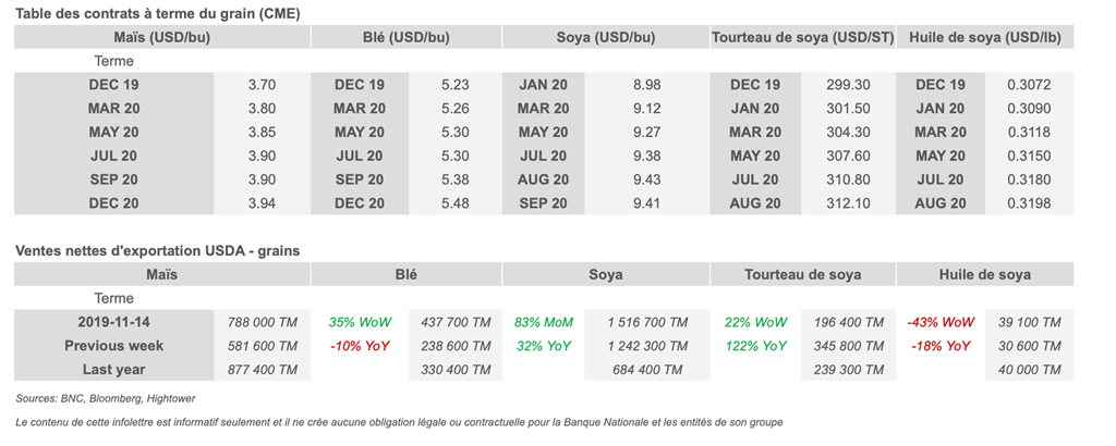 • Les contrats à terme de soya et maïs ont augmenté, étant donné qu’un accord commercial de première phase entre les États-Unis et la Chine pourrait être très proche, ce qui pourrait permettre de débloquer de nouveaux achats importants de produits agricoles américains.