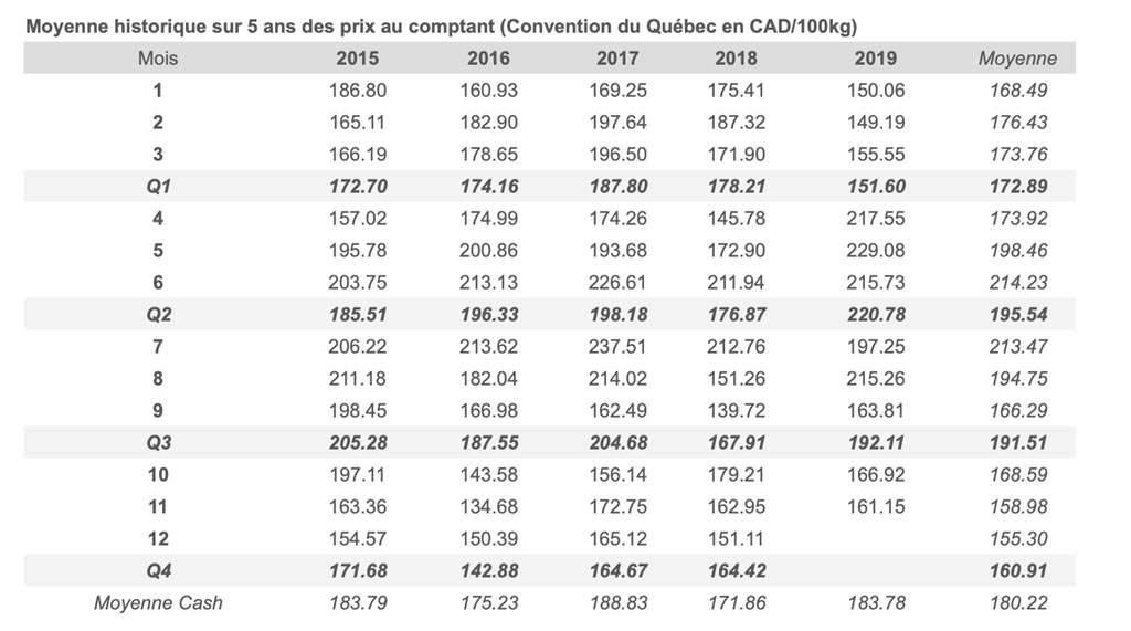 Voici les prix les plus récents sur le marché du porc et des grains: