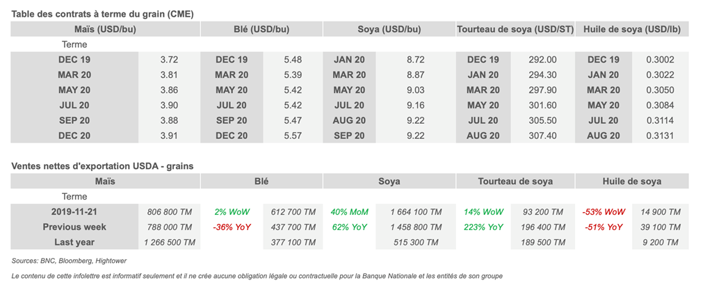 • L'évolution des négociations entre la Chine est les États-Unis semble avoir fait un pas vers l'arrière, avec Trump qui revient sur des menaces de tarifs and des doutes qui se réinstallent sur le potentiel d'un accord de la phase 1.