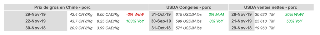 • Les inventaires de porcs en Chine ont augmenté de 2% en novembre par rapport au mois précédent. Il s'agit de la première augmentation en 12 mois. Le nombre de truies reproductrices est en hausse de 4%. Bien que l'offre reste serrée, il s'agit d'une nouvelle encourageante qui laisse croire que la production porcine chinoise pourrait reprendre comme prévu par les délégués officiels en Chine.