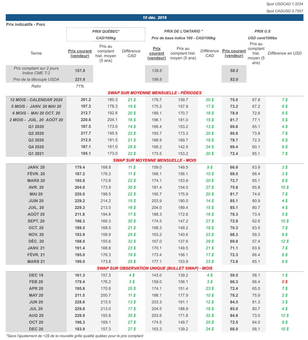 Voici les prix les plus récents sur le marché du porc et des grains: