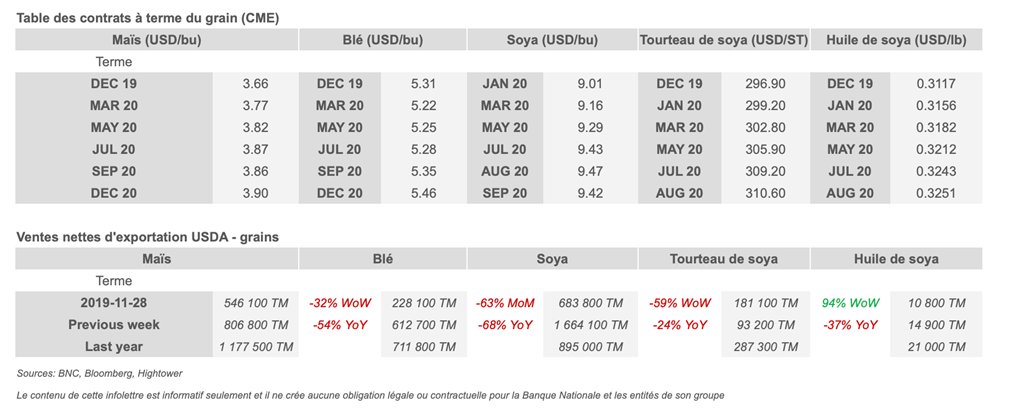 • La Chine pourrait être épargnée des nouveaux tarrifs du 15 décembre. Les négociateurs américains et chinois ont signalé qu'ils pourraient s'entendre sur la première phase d'un accord plus large qui résoudrait le différend commercial, a déclaré le conseiller économique de la Maison Blanche, Larry Kudlow.