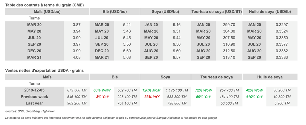 • Les États-Unis et la Chine ont convenu de la première phase d'un accord commercial plus large. L'accord de phase 1 repose sur l'augmentation des achats de produits agricoles américains tels que le soya et le porc par la Chine et sur la prise de nouveaux engagements en matière de propriété intellectuelle, de transfert forcé de technologie et de devises. La Chine a pris des engagements agricoles détaillés qui lui permettraient d'acheter au moins 16 milliards de dollars supplémentaires par an en produits de base en plus du niveau d'avant-guerre de 24 milliards de dollars et s'efforceraient d'en acheter jusqu'à 50 milliards par an, selon le représentant américain au commerce Robert Lighthizer. Alors que les doutes ont fait surfacequant à savoir si ce niveau pourrait finalement être atteint, de meilleures relations commerciales pourraient aider à relancer les marchés américains éviter de céder une part des exportations à des rivaux comme le Brésil.