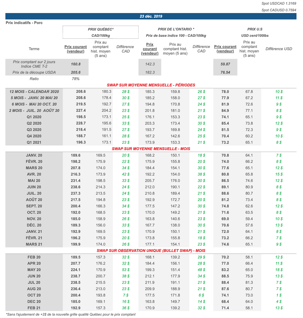 Voici les prix les plus récents sur le marché du porc et des grains: