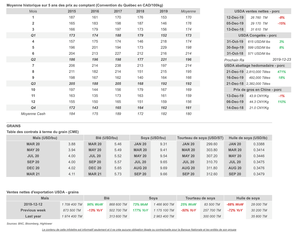 • Les agriculteurs commencent enfin à voir un peu de lumière au bout du tunnel commercial, ce qui crée de l'espoir pour 2020. Après plusieurs mois de dommages collatéraux d'une guerre commerciale et en attendant la conclusion de divers accords commerciaux, des progrès sont enfin réalisés. La Chine a annoncé lundi qu'elle réduirait les tarifs le 1er janvier sur plus de 850 produits étrangers, notamment le porc congelé, les médicaments contre l'asthme et certains composants de haute technologie pour stimuler le développement économique. Cette annonce fait suite à un accord commercial intérimaire avec Washington dans une guerre tarifaire qui a secoué les marchés financiers.