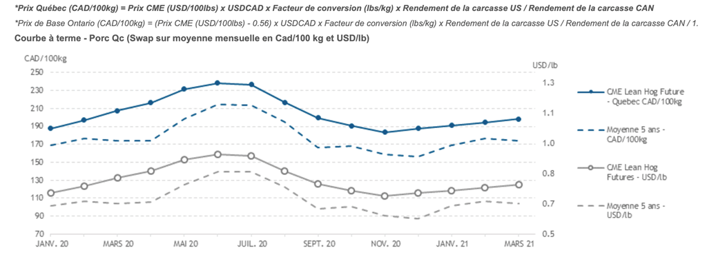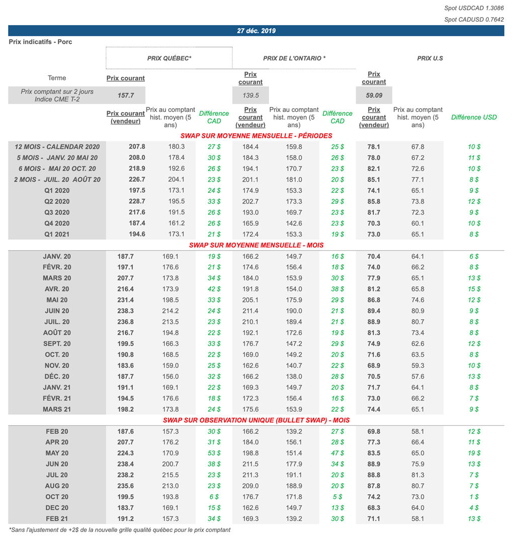 Voici les prix les plus récents sur le marché du porc et des grains: