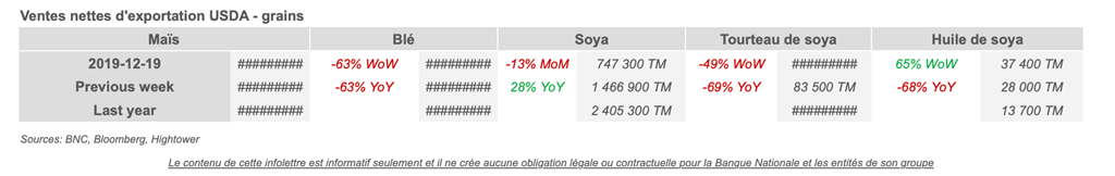 • Les ventes nettes de 715 000 MT pour 2019/2020 ont diminué de 18% par rapport à la semaine précédente, mais ont augmenté de 37% par rapport à la moyenne des 4 semaines précédentes.