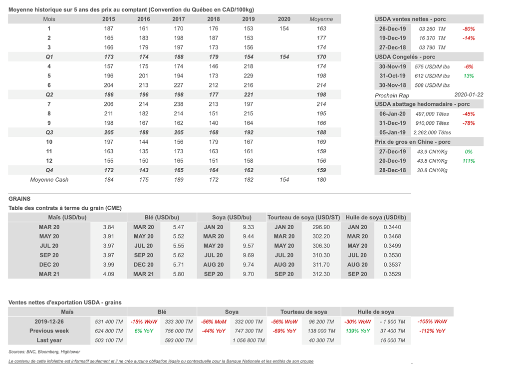 Voici les prix les plus récents sur le marché du porc et des grains: