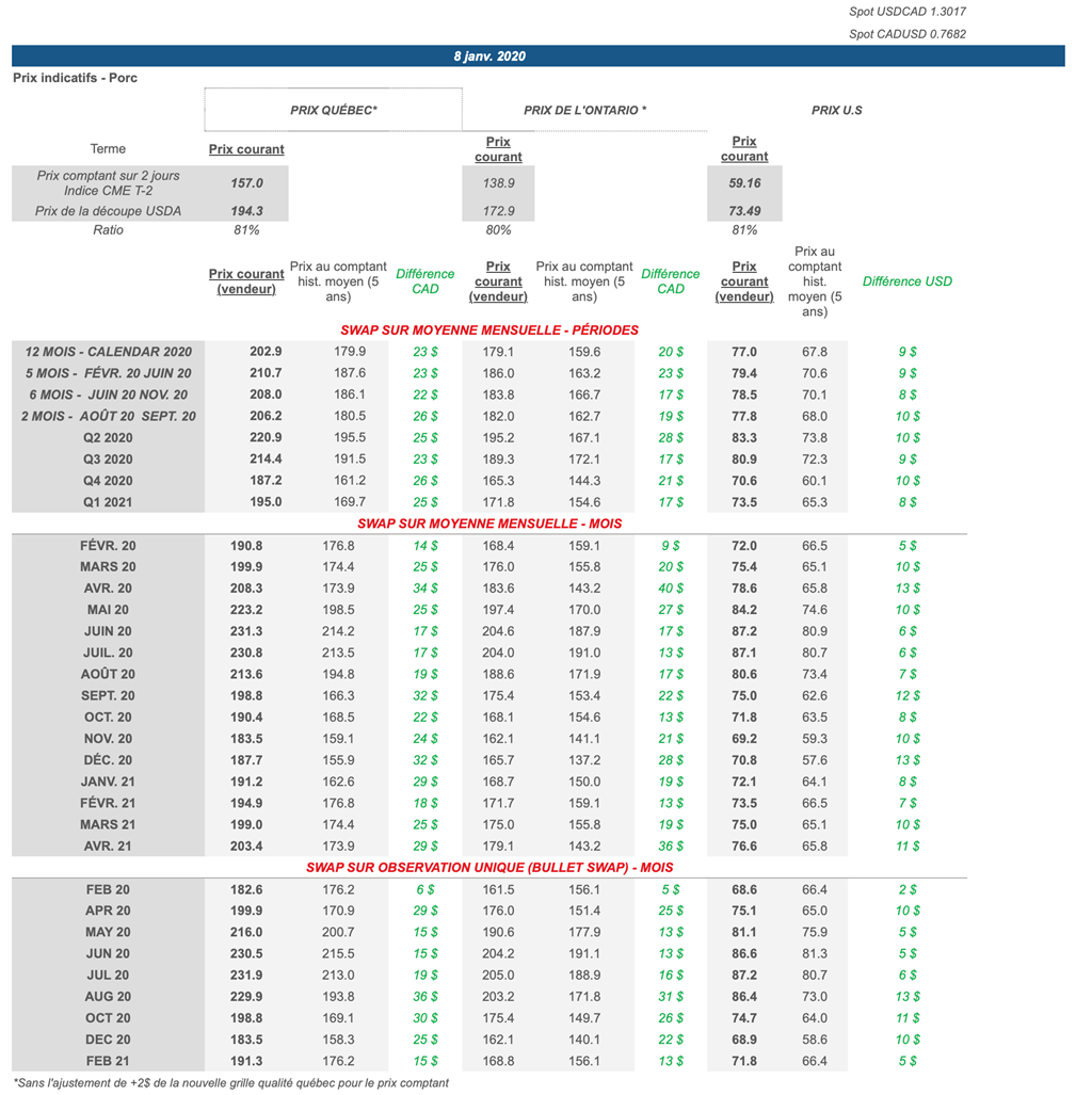 Voici les prix les plus récents sur le marché du porc et des grains: