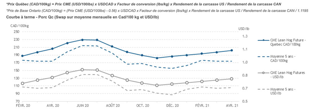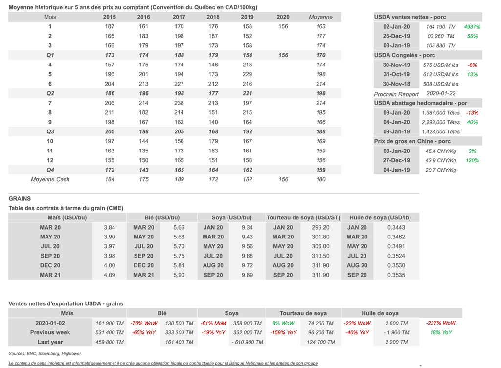 Voici les prix les plus récents sur le marché du porc et des grains: