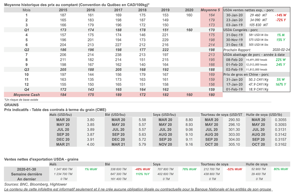 • Les vacances prolongées du Nouvel An lunaire chinois se sont terminées dimanche; néanmoins, les prix du porc en Chine n’ont pas diminué malgré la propagation du coronavirus et le ralentissement de l’activité économique.