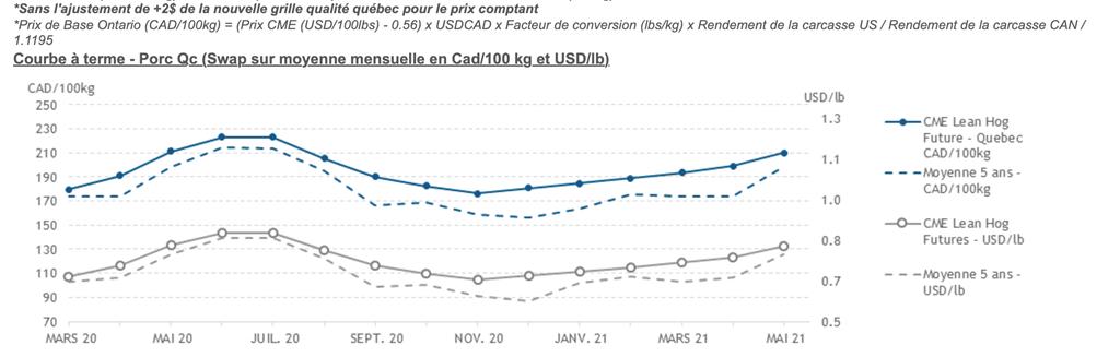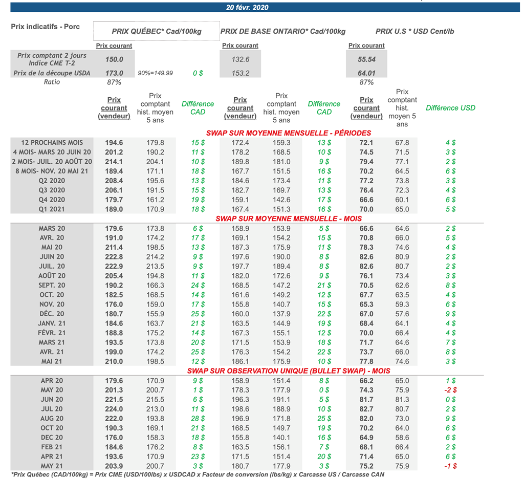 Voici les prix les plus récents sur le marché du porc et des grains: