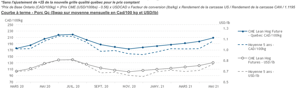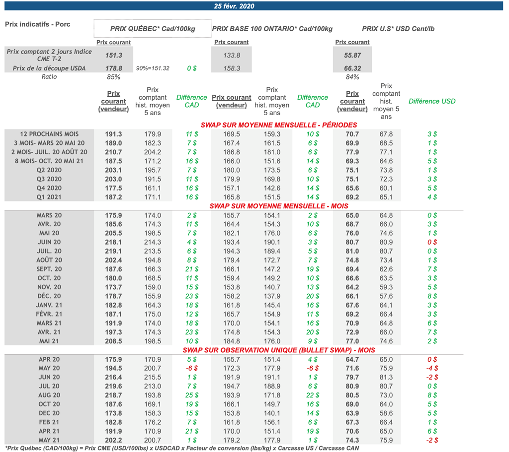 Voici les prix les plus récents sur le marché du porc et des grains: