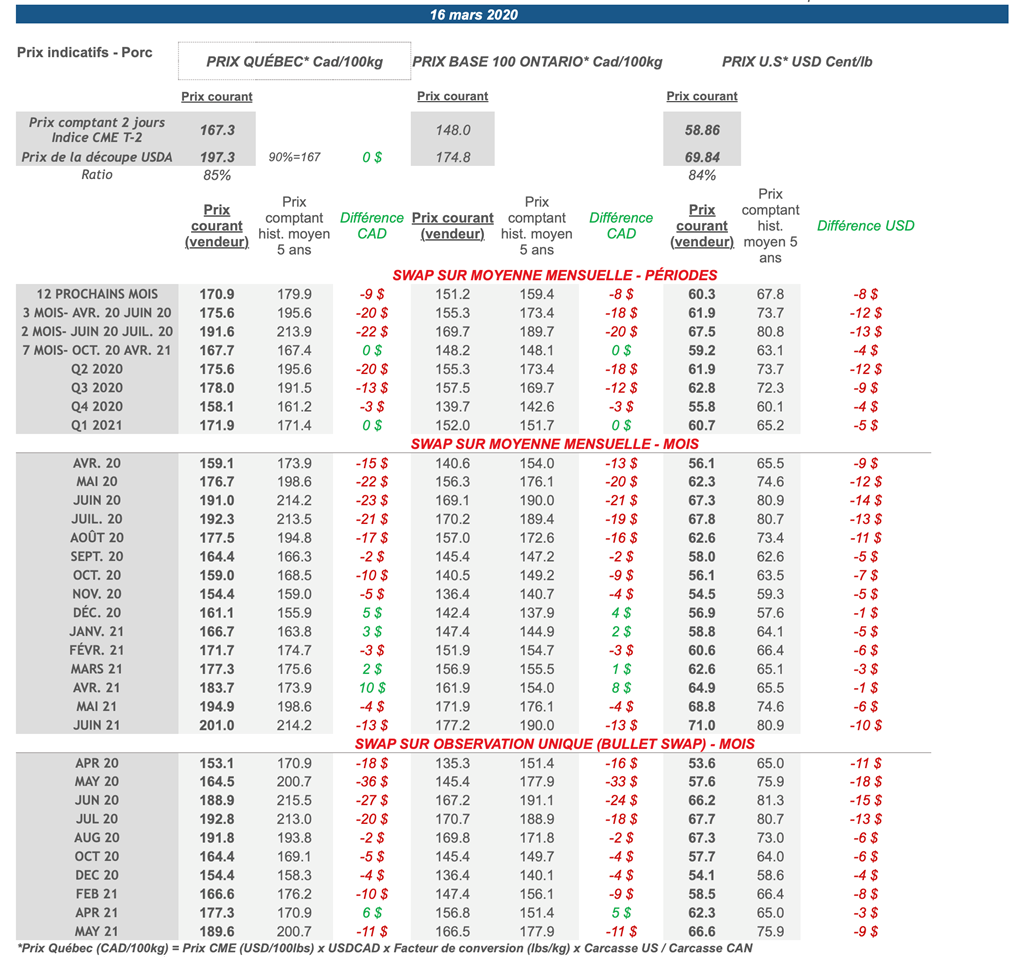 Voici les prix les plus récents sur le marché du porc et des grains: