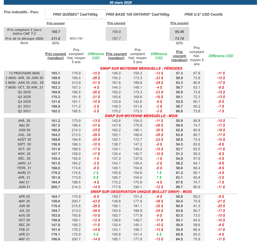 Voici les prix les plus récents sur le marché du porc et des grains: