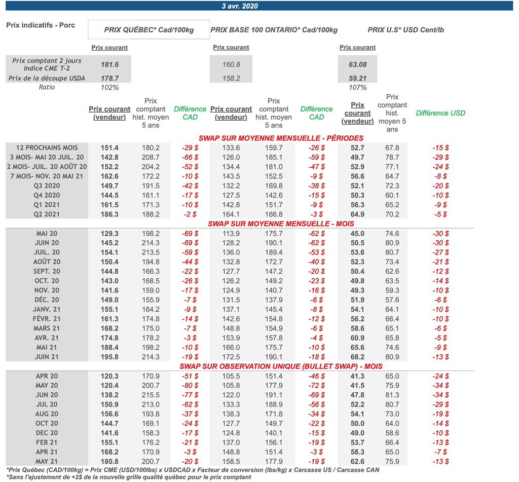 • Les contrats sur le porc ont terminé la journée en baisse hier pour toutes les échéances. Les contrats d’avril, mai, juin, juillet et août 2020 ont atteint le « limit-down » de -4,50 USD cents/lb.