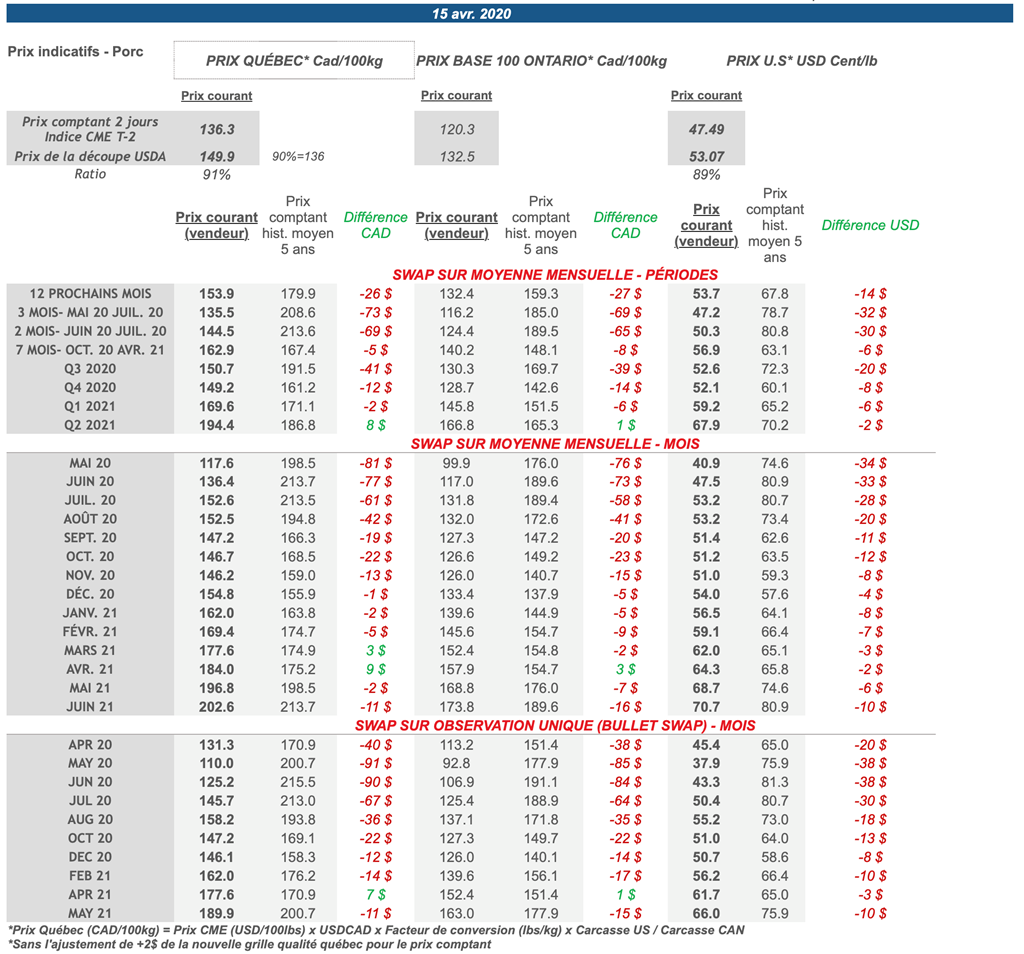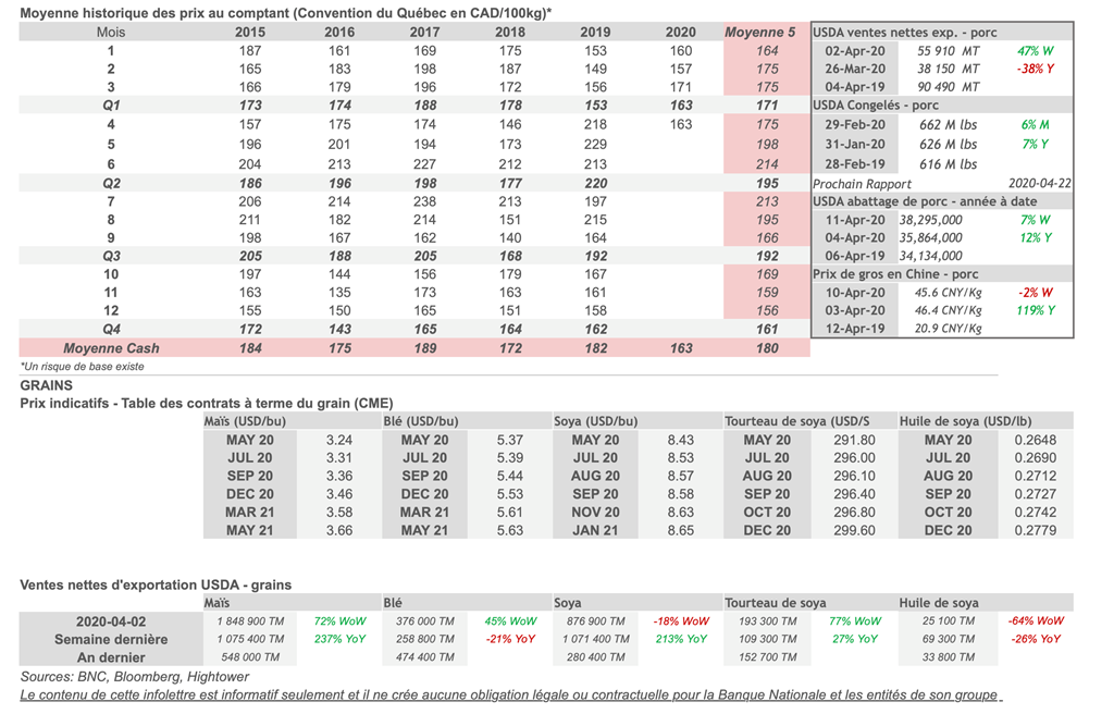 • La situation se détériore aux États-Unis; les abattoirs se mettent sur pause alors que des cas des COVID-19 se retrouvent parmis leurs travailleurs. Plusieurs producteurs de porcs sont à risque de ne pas être en mesure de passer au travers et même plusieurs sources ont mention de producteurs qui arrivent à l'étape d'euthanasier à la ferme.