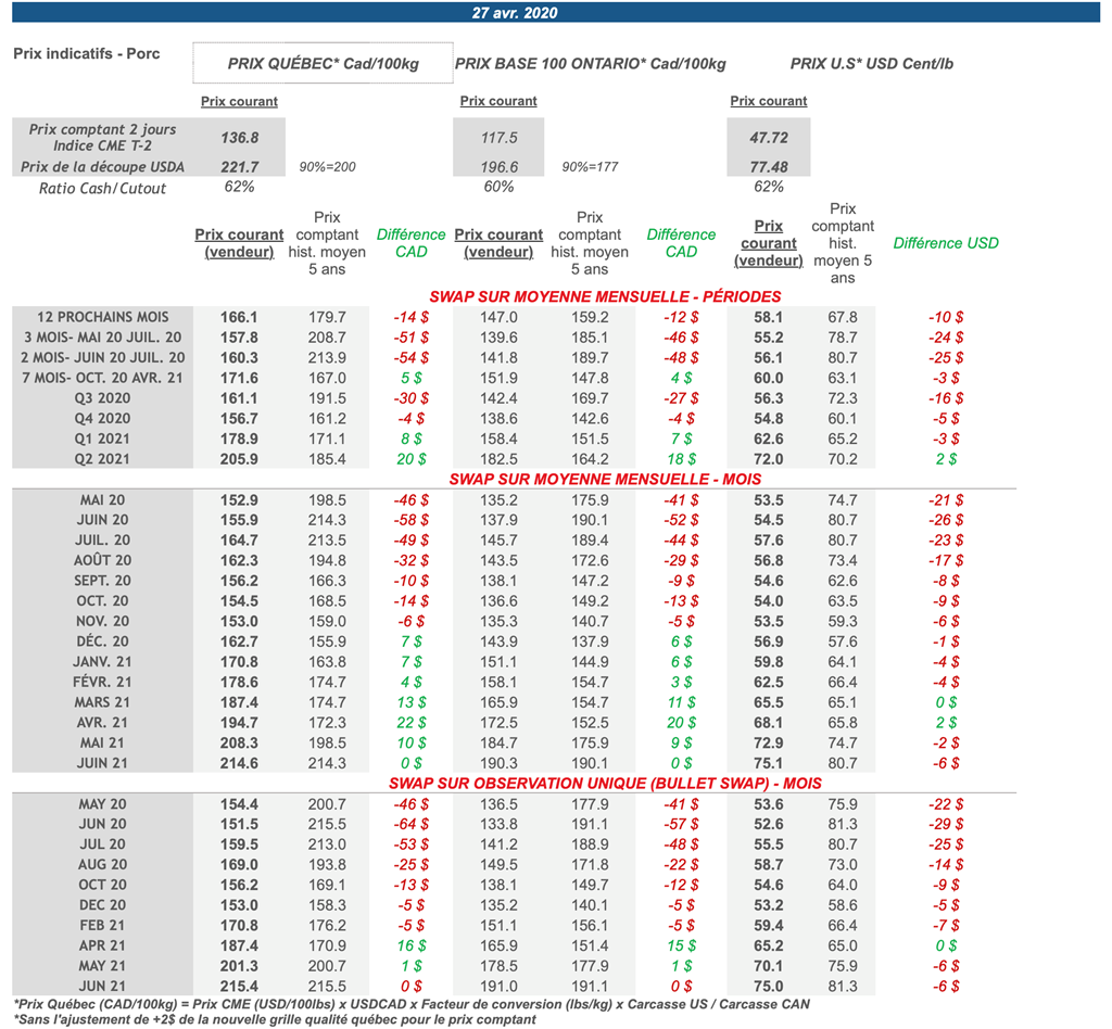 • Les prix des contrats de porc ont gagné du terrain à nouveau vendredi, à l'exception du mois de juin 2020 qui était en retrait de 0.1 cents USD/lb.