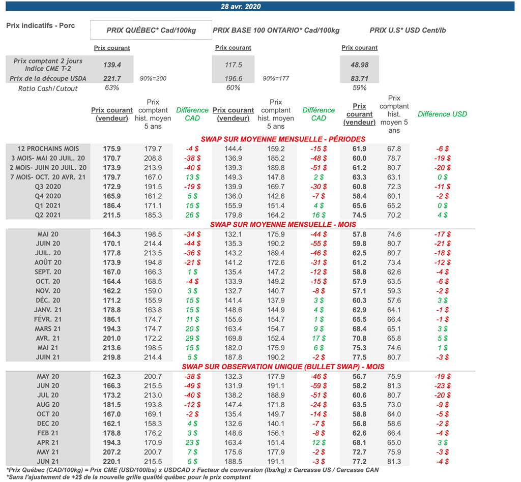 • Les prix des contrats de porc ont terminé la journée avec de bons gains. Les mois de mai à août 2020 ont même atteint la limite à la hausse.