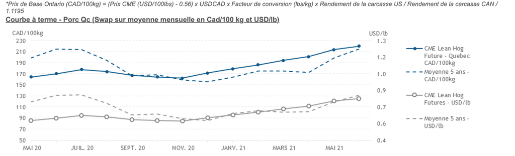 • Rien ne semble vouloir déjouer la valeur de la découpe de porc U.S. de sa trajectoire, ayant terminé lundi à 83,71 cents USD/lb (+6,23 cents USD/lb). Ce niveau dépasse même son haut de mars qui se positionnait à 83,51 cents USD/lb.