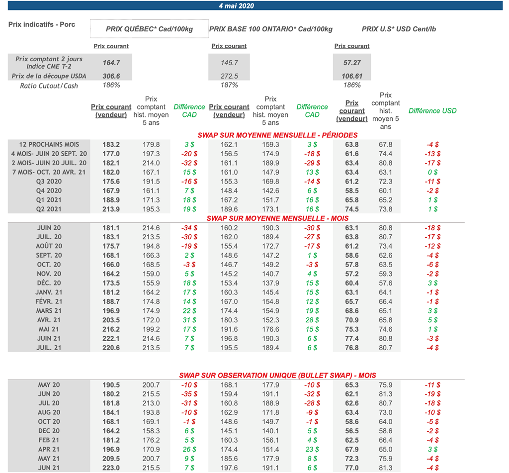• Les contrats de porcs ont commencé le mois de mai en force en terminant en hausse pour toutes les échéances vendredi dernier. Les contrats de mai et juin 2020 ont fait des gains qui ont atteint le « limit-up » de 3,75 cents USD/lb et les contrats ont terminé la semaine à 62,875 et 62,700 cents USD/lb respectivement. Du prix de clôture de lundi au prix de clôture de vendredi le les contrats de mai et juin 2020 se sont apprécié de 6,61 (+11,7%) et 7,43 (+13,4%) cents USD/lb.