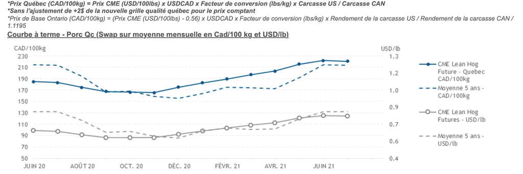 • Les contrats de porc étaient en hausse hier pour toutes les échéances sauf celle de mai 2021 qui a renversé en territoire négatif avant la fin de la session. Les contrats de mai et juin 2020 se sont particulièrement appréciés avec des gains de 4,85 (+7,71%) et 2,80 (+4,47%) cents USD/lb.