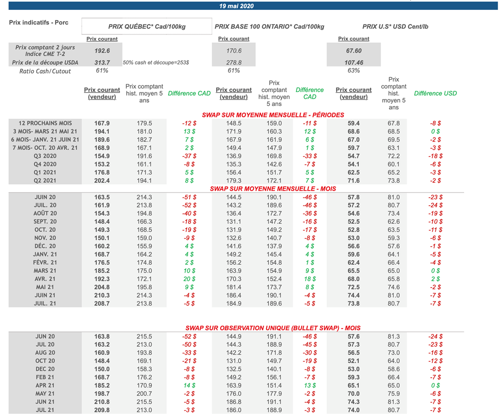 • Les contrats de porc étaient en hausse hier sauf pour les échéances de juin et juillet 2020 ainsi qu'octobre 2021.