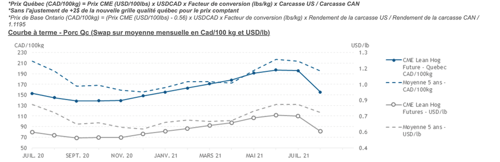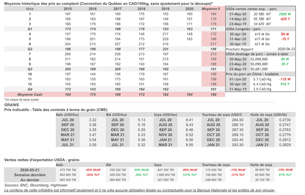 Voici les prix les plus récents sur le marché du porc et des grains: