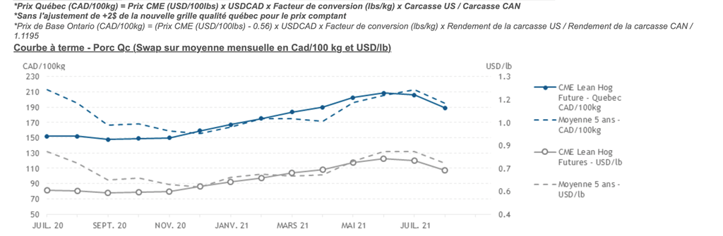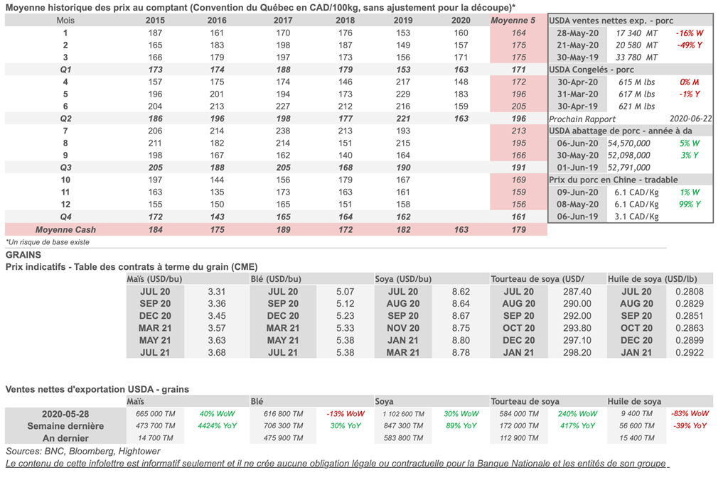 • Dennis Smith de Archer Financial Services Inc. est d'avis que le prix des contrats de porcs reprendront de la vigueur. Il estime que 3M de porcs devront encore être euthanasiés aux États-Unis au cours de l'été, même si la capacité d'abattage augmente avec la réouverture des abattoirs. De plus, les chiffres du WASDE de mai de l'USDA estimaient que la production de porcs serait en baisse seraient baisse en 2020. Avec la diminution de l'offre de viande de porc, la reprise de la demande domestique U.S. et la demande pour l'exportation atteignant à un sommet, les forces de marchés pourraient soutenir le prix du porc. Les propos de Brownfield Ag News vont dans la même direction: "Tant que la demande domestique et internationale persistent, cela devrait aider à soutenir les prix dans une certaine mesure."