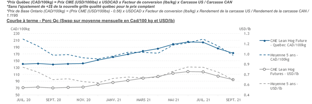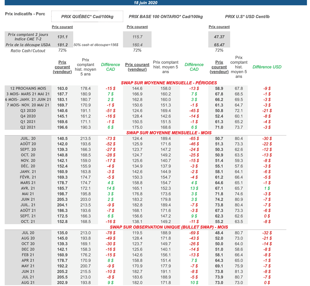 Voici les prix les plus récents sur le marché du porc et des grains: