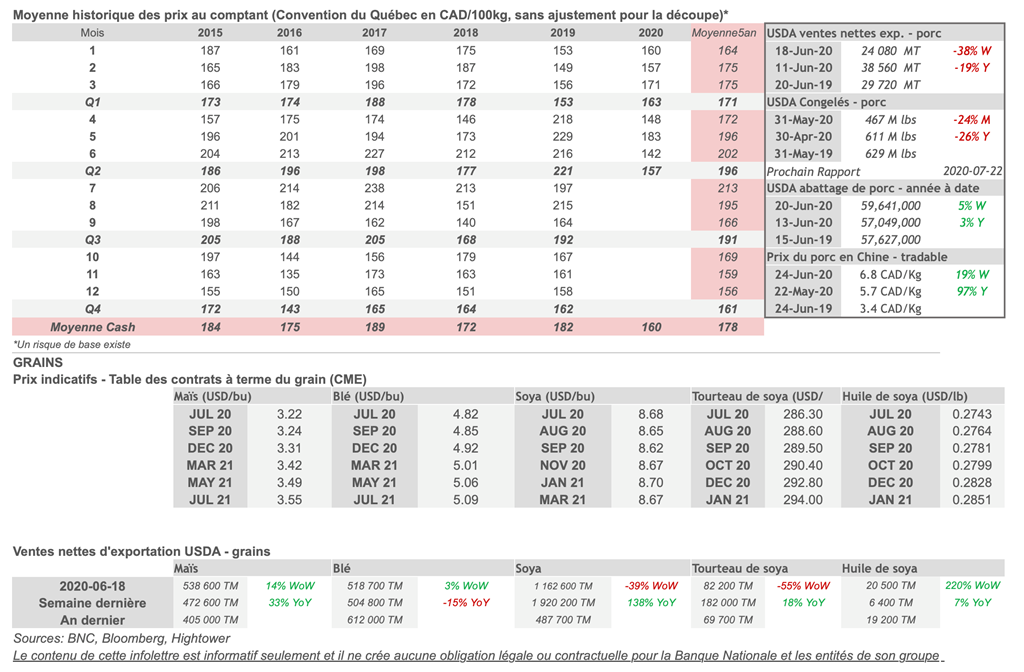 Voici les prix les plus récents sur le marché du porc et des grains: