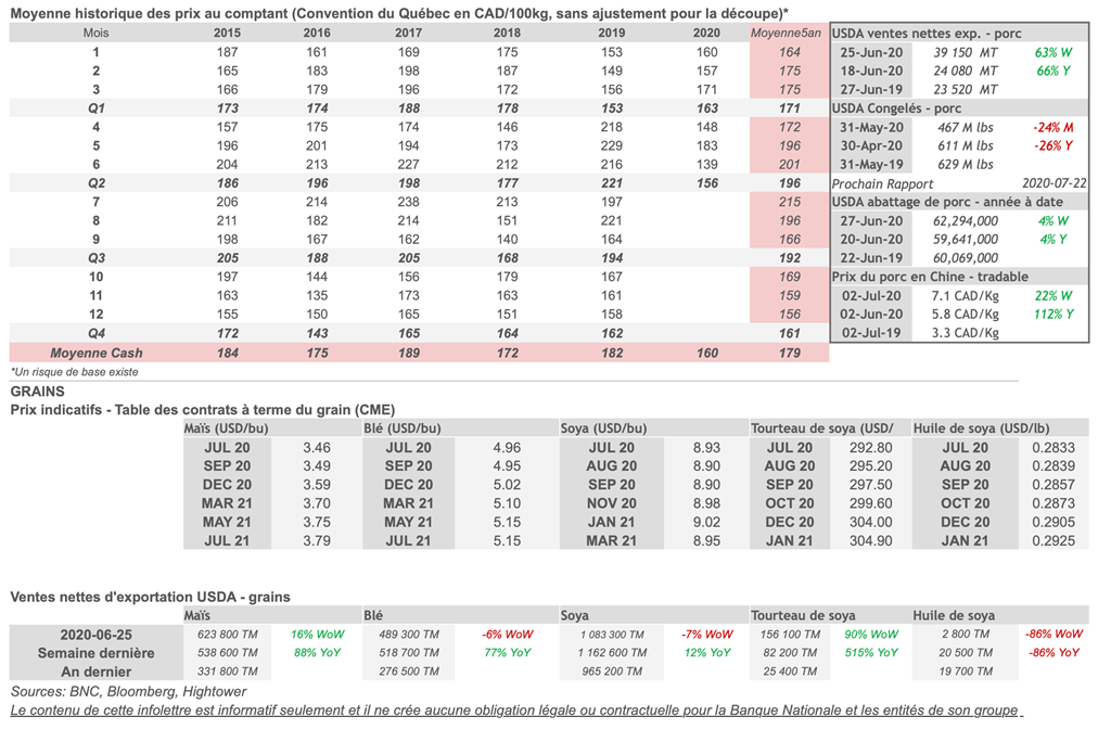 • Les contrats de porc ont terminé la journée en baisse hier pour toutes les échéances, sauf le contrat d'août 2020 qui est demeuré presque inchangé.