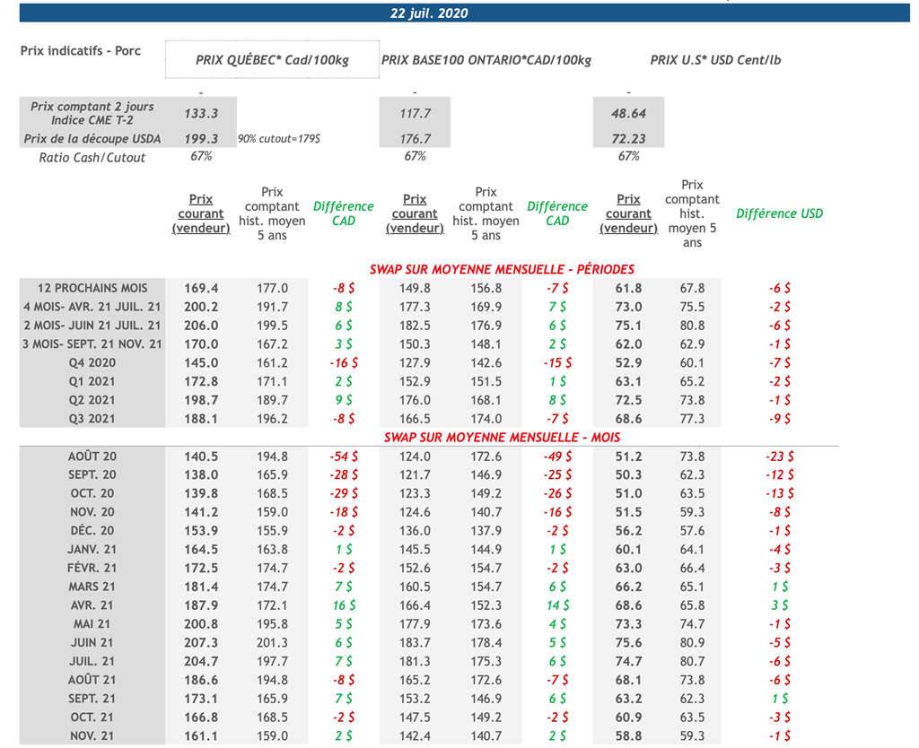 • L’indice de découpe de porc U.S. s'est établi à 72,23 cents USD/lb hier. Les prix de toutes les coupes étaient en hausse et l'indice est à son plus haut niveau depuis le début du mois de juin.