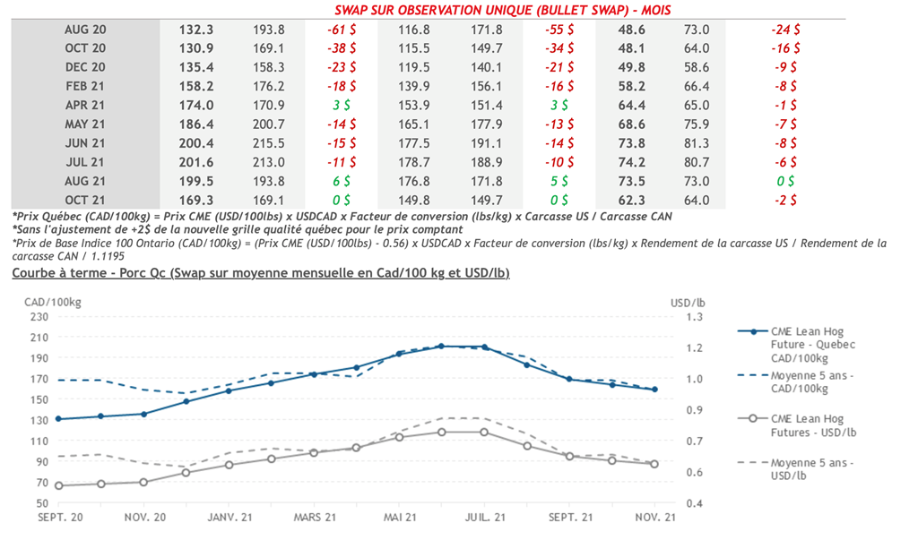 • Les contrats de porc ont terminé la journée en baisse hier pour la plupart des échéances, à l'exception des contrats d'octobre et de décembre 2020. Les pertes et les gains ont été moins de 1 cent USD/lb.